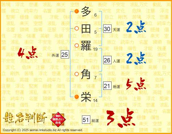 多(6画)田(5画)羅(19画) 角(7画)栄(14画)