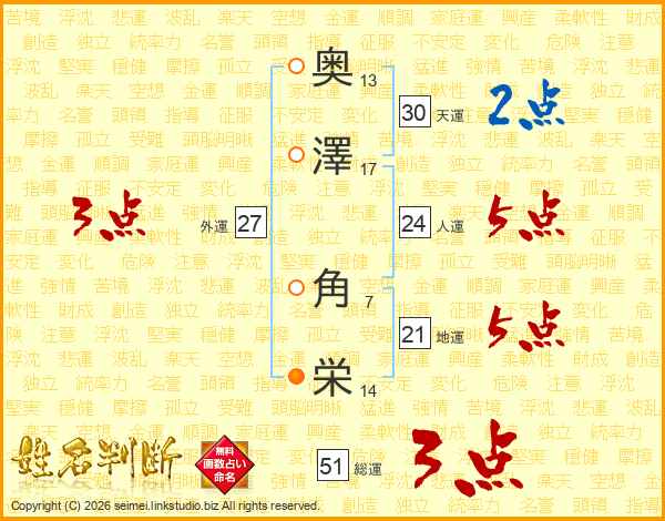 奥(13画)澤(17画) 角(7画)栄(14画)