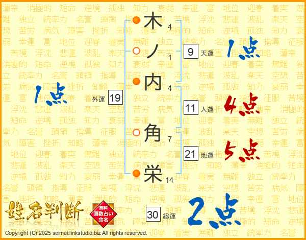 木(4画)ノ(1画)内(4画) 角(7画)栄(14画)