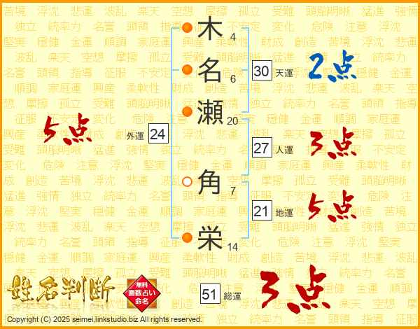 木(4画)名(6画)瀬(20画) 角(7画)栄(14画)