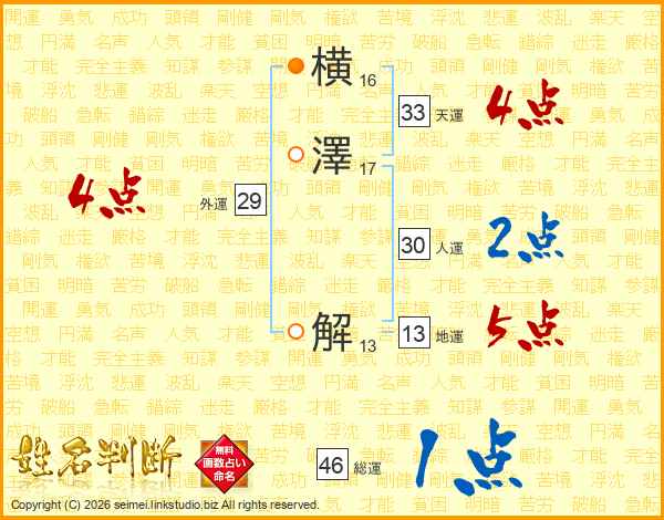 生活面を象徴する運勢です。外部から受ける影響力を表し、結婚運、家庭運や職場、環境への順応性を表します。総運から人運を引いた画数。姓や名が1文字の場合を除く。