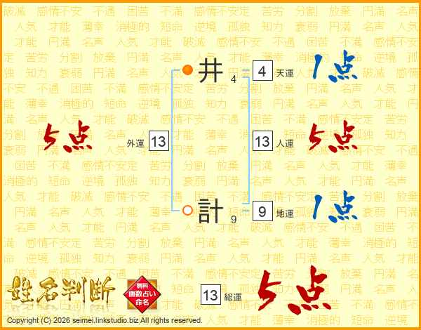 生活面を象徴する運勢です。外部から受ける影響力を表し、結婚運、家庭運や職場、環境への順応性を表します。総運から人運を引いた画数。姓や名が1文字の場合を除く。