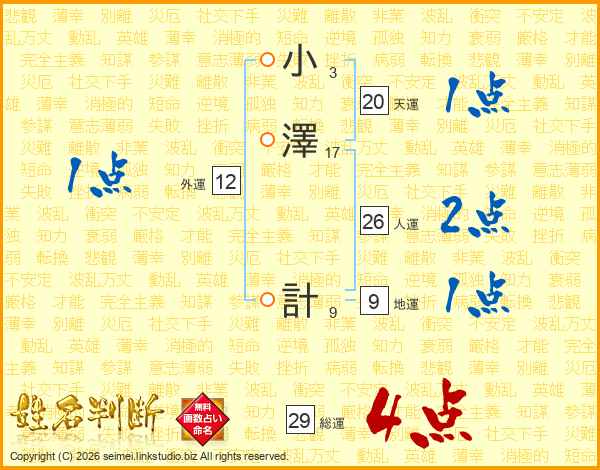 生活面を象徴する運勢です。外部から受ける影響力を表し、結婚運、家庭運や職場、環境への順応性を表します。総運から人運を引いた画数。姓や名が1文字の場合を除く。