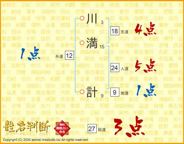 生活面を象徴する運勢です。外部から受ける影響力を表し、結婚運、家庭運や職場、環境への順応性を表します。総運から人運を引いた画数。姓や名が1文字の場合を除く。