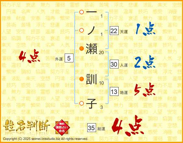 生活面を象徴する運勢です。外部から受ける影響力を表し、結婚運、家庭運や職場、環境への順応性を表します。総運から人運を引いた画数。姓や名が1文字の場合を除く。