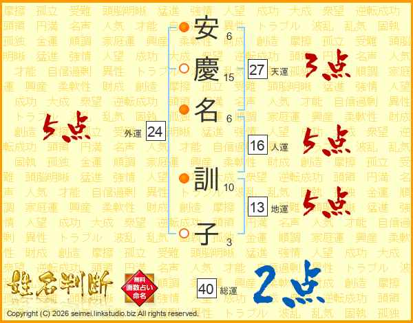 安(6画)慶(15画)名(6画) 訓(10画)子(3画)
