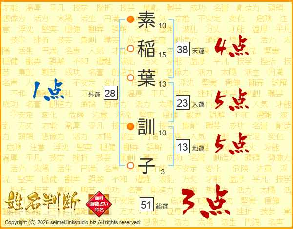素(10画)稲(15画)葉(13画) 訓(10画)子(3画)