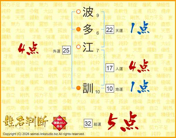生活面を象徴する運勢です。外部から受ける影響力を表し、結婚運、家庭運や職場、環境への順応性を表します。総運から人運を引いた画数。姓や名が1文字の場合を除く。