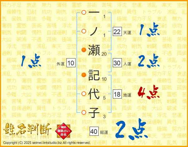 一(1画)ノ(1画)瀬(20画) 記(10画)代(5画)子(3画)