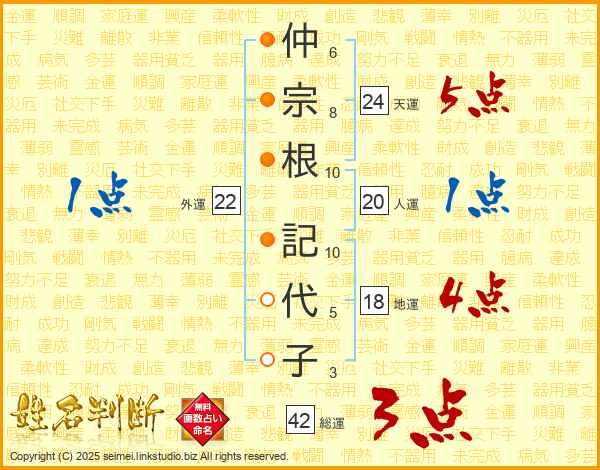 仲(6画)宗(8画)根(10画) 記(10画)代(5画)子(3画)