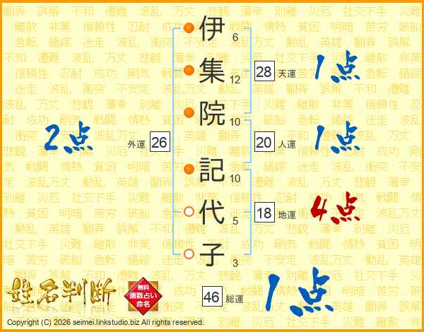 伊(6画)集(12画)院(10画) 記(10画)代(5画)子(3画)