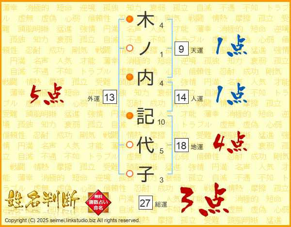 木(4画)ノ(1画)内(4画) 記(10画)代(5画)子(3画)
