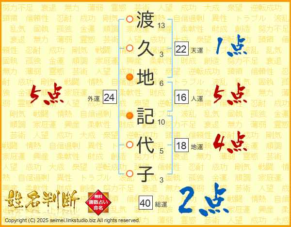渡(13画)久(3画)地(6画) 記(10画)代(5画)子(3画)