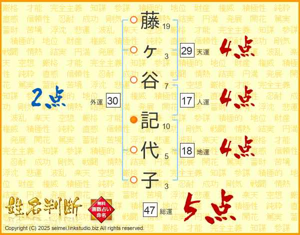 藤(19画)ヶ(3画)谷(7画) 記(10画)代(5画)子(3画)