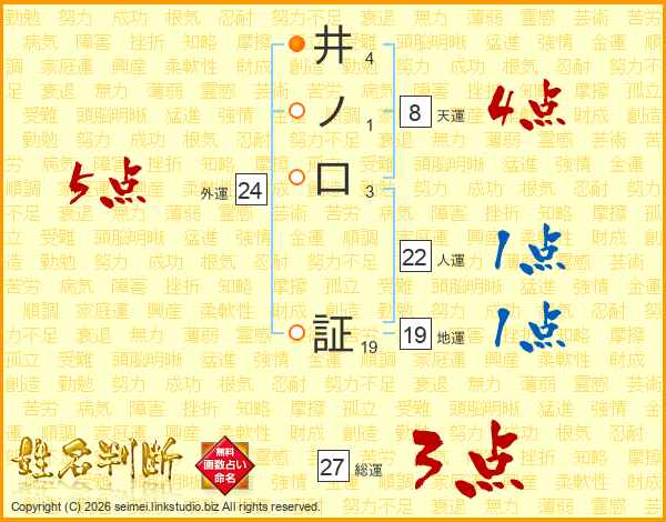生活面を象徴する運勢です。外部から受ける影響力を表し、結婚運、家庭運や職場、環境への順応性を表します。総運から人運を引いた画数。姓や名が1文字の場合を除く。