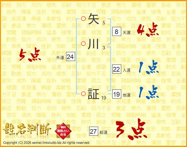 生活面を象徴する運勢です。外部から受ける影響力を表し、結婚運、家庭運や職場、環境への順応性を表します。総運から人運を引いた画数。姓や名が1文字の場合を除く。
