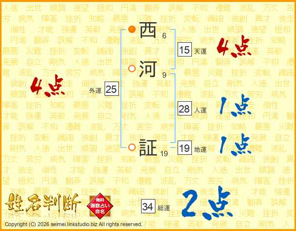 生活面を象徴する運勢です。外部から受ける影響力を表し、結婚運、家庭運や職場、環境への順応性を表します。総運から人運を引いた画数。姓や名が1文字の場合を除く。