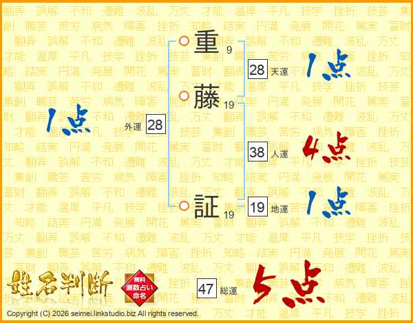 あなたの人生を表す1番重要な運勢です。生涯を通じて影響する総合運となり、主に50歳以降の晩年期に影響を及ぼします。苗字と名前の合計画数。