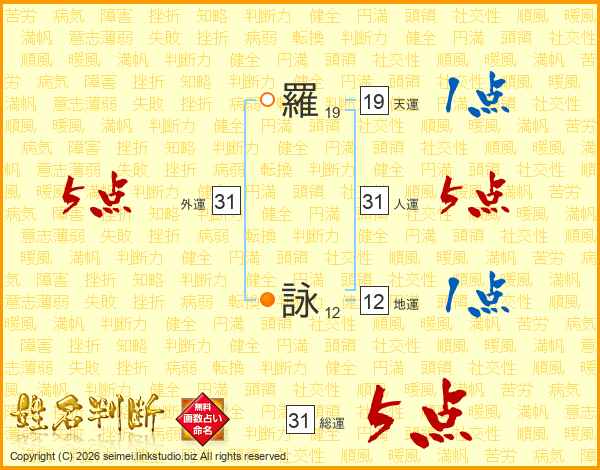 生活面を象徴する運勢です。外部から受ける影響力を表し、結婚運、家庭運や職場、環境への順応性を表します。総運から人運を引いた画数。姓や名が1文字の場合を除く。