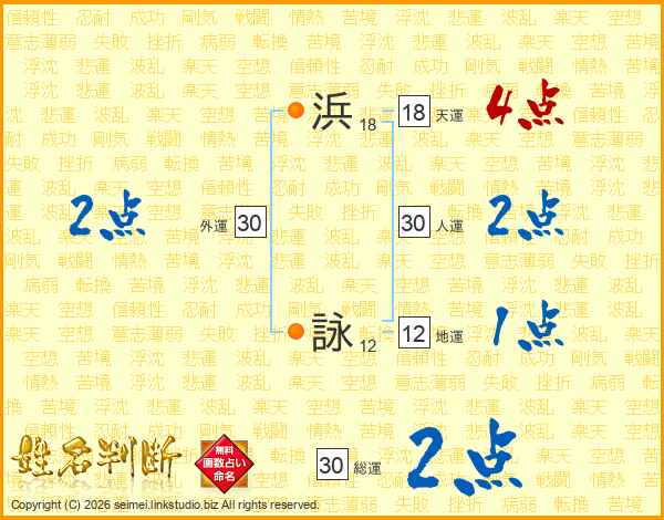 生活面を象徴する運勢です。外部から受ける影響力を表し、結婚運、家庭運や職場、環境への順応性を表します。総運から人運を引いた画数。姓や名が1文字の場合を除く。
