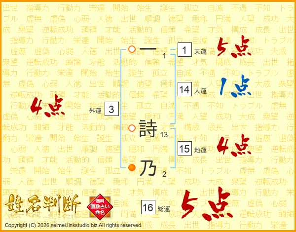 生活面を象徴する運勢です。外部から受ける影響力を表し、結婚運、家庭運や職場、環境への順応性を表します。総運から人運を引いた画数。姓や名が1文字の場合を除く。