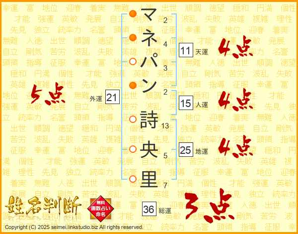マ(2画)ネ(4画)パ(3画)ン(2画) 詩(13画)央(5画)里(7画)