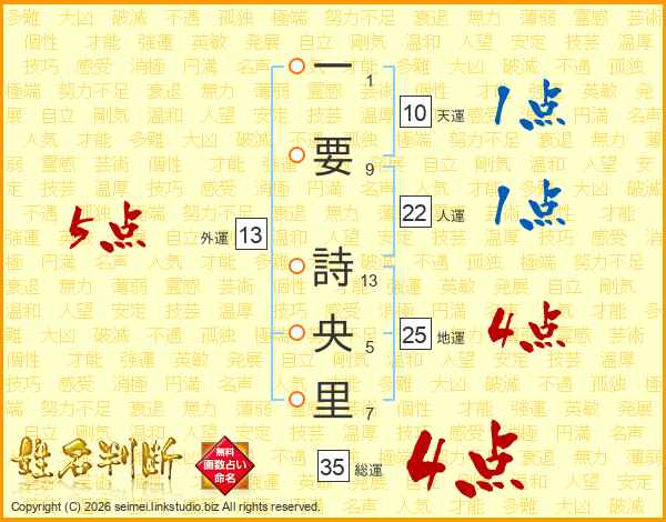 一(1画)要(9画) 詩(13画)央(5画)里(7画)