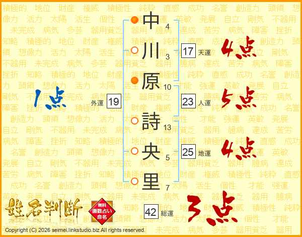 中(4画)川(3画)原(10画) 詩(13画)央(5画)里(7画)