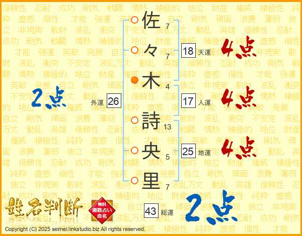 佐(7画)々(7画)木(4画) 詩(13画)央(5画)里(7画)