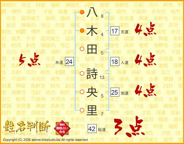 八(8画)木(4画)田(5画) 詩(13画)央(5画)里(7画)