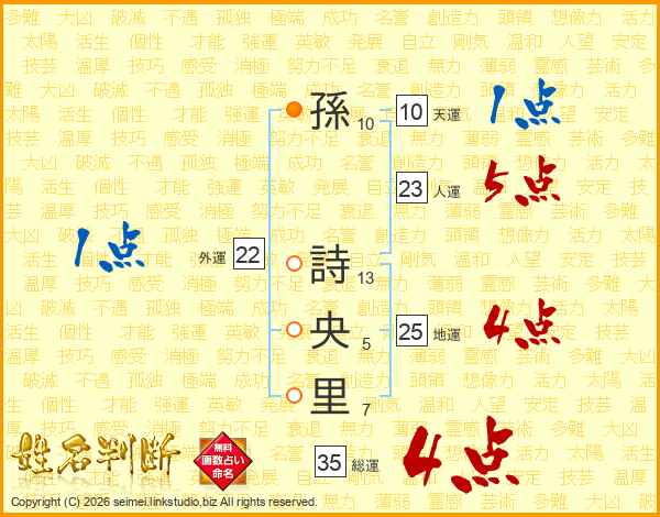 孫(10画) 詩(13画)央(5画)里(7画)