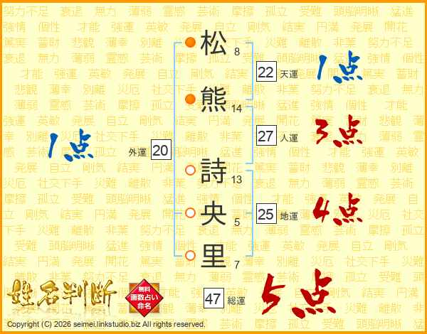 松(8画)熊(14画) 詩(13画)央(5画)里(7画)