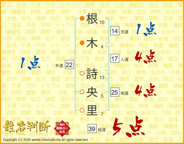 根(10画)木(4画) 詩(13画)央(5画)里(7画)