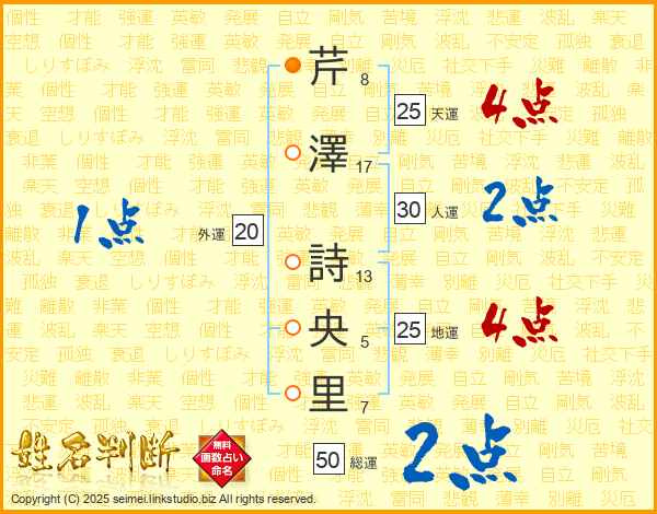 芹(8画)澤(17画) 詩(13画)央(5画)里(7画)