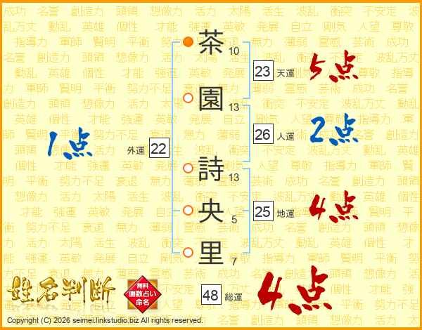 茶(10画)園(13画) 詩(13画)央(5画)里(7画)