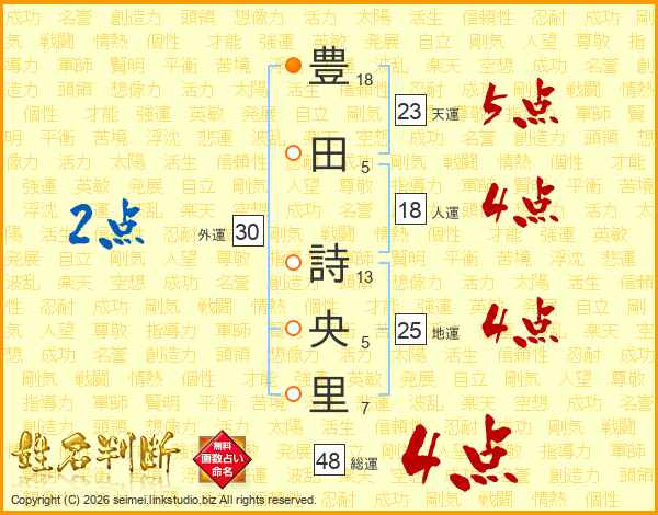 豊(18画)田(5画) 詩(13画)央(5画)里(7画)