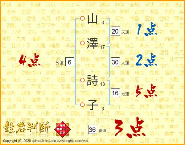 山(3画)澤(17画) 詩(13画)子(3画)