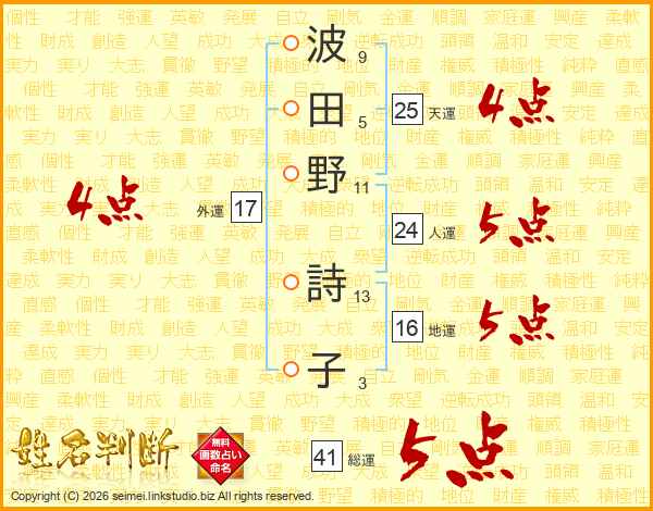 波(9画)田(5画)野(11画) 詩(13画)子(3画)