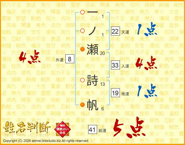 一(1画)ノ(1画)瀬(20画) 詩(13画)帆(6画)