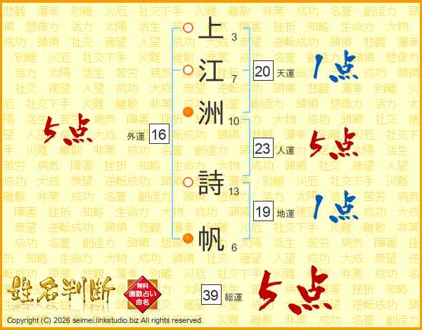 生活面を象徴する運勢です。外部から受ける影響力を表し、結婚運、家庭運や職場、環境への順応性を表します。総運から人運を引いた画数。姓や名が1文字の場合を除く。