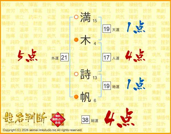 満(15画)木(4画) 詩(13画)帆(6画)