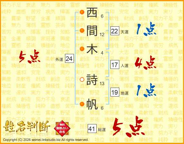 西(6画)間(12画)木(4画) 詩(13画)帆(6画)