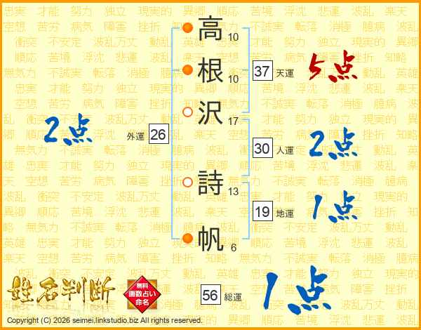 高(10画)根(10画)沢(17画) 詩(13画)帆(6画)
