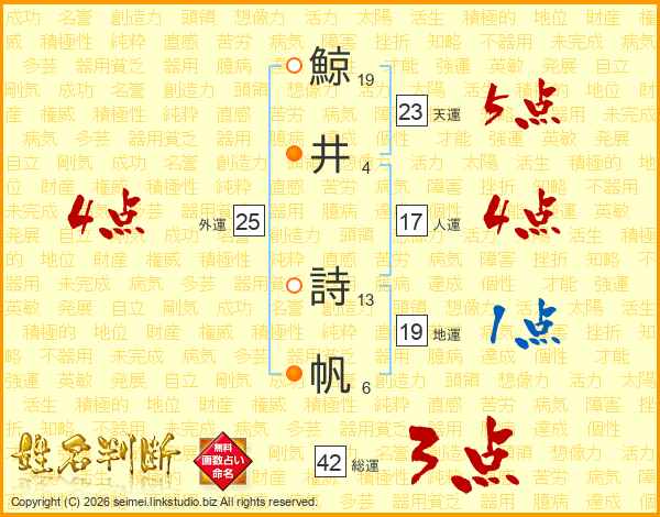 鯨(19画)井(4画) 詩(13画)帆(6画)