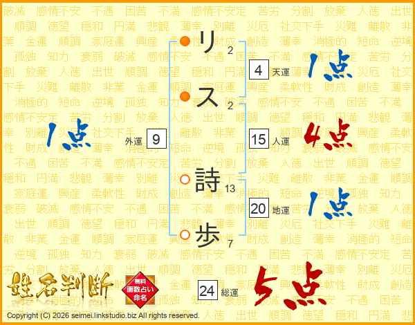 リス詩歩さんの総運は24画の5点!