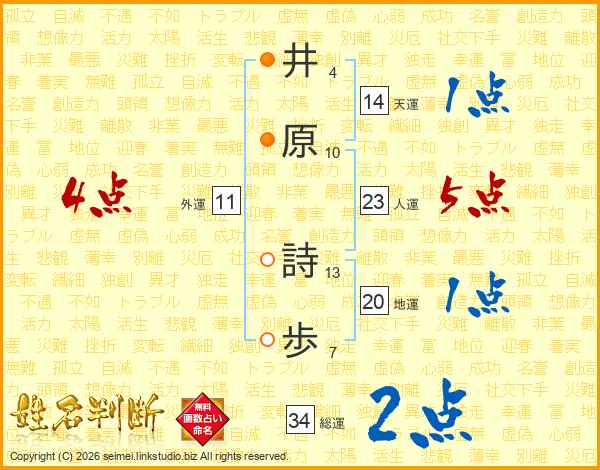 生活面を象徴する運勢です。外部から受ける影響力を表し、結婚運、家庭運や職場、環境への順応性を表します。総運から人運を引いた画数。姓や名が1文字の場合を除く。