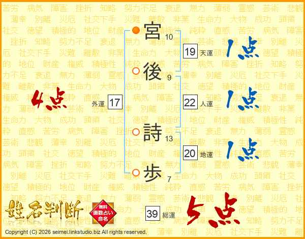 宮(10画)後(9画) 詩(13画)歩(7画)