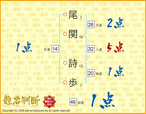 尾(7画)関(19画) 詩(13画)歩(7画)