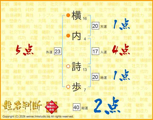 生活面を象徴する運勢です。外部から受ける影響力を表し、結婚運、家庭運や職場、環境への順応性を表します。総運から人運を引いた画数。姓や名が1文字の場合を除く。