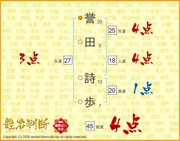 誉(20画)田(5画) 詩(13画)歩(7画)